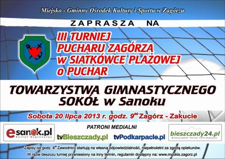 W sobotę, 20 lipca 2013 r. w Zagórzu w ośrodku sportów „Zakucie” odbył się Turniej Piłki Plażowej o „Puchar Towarzystwa Gimnastycznego „Sokół” w Sanoku”, trzeci z cyklu całego Turnieju o Puchar Burmistrza Zagórza.